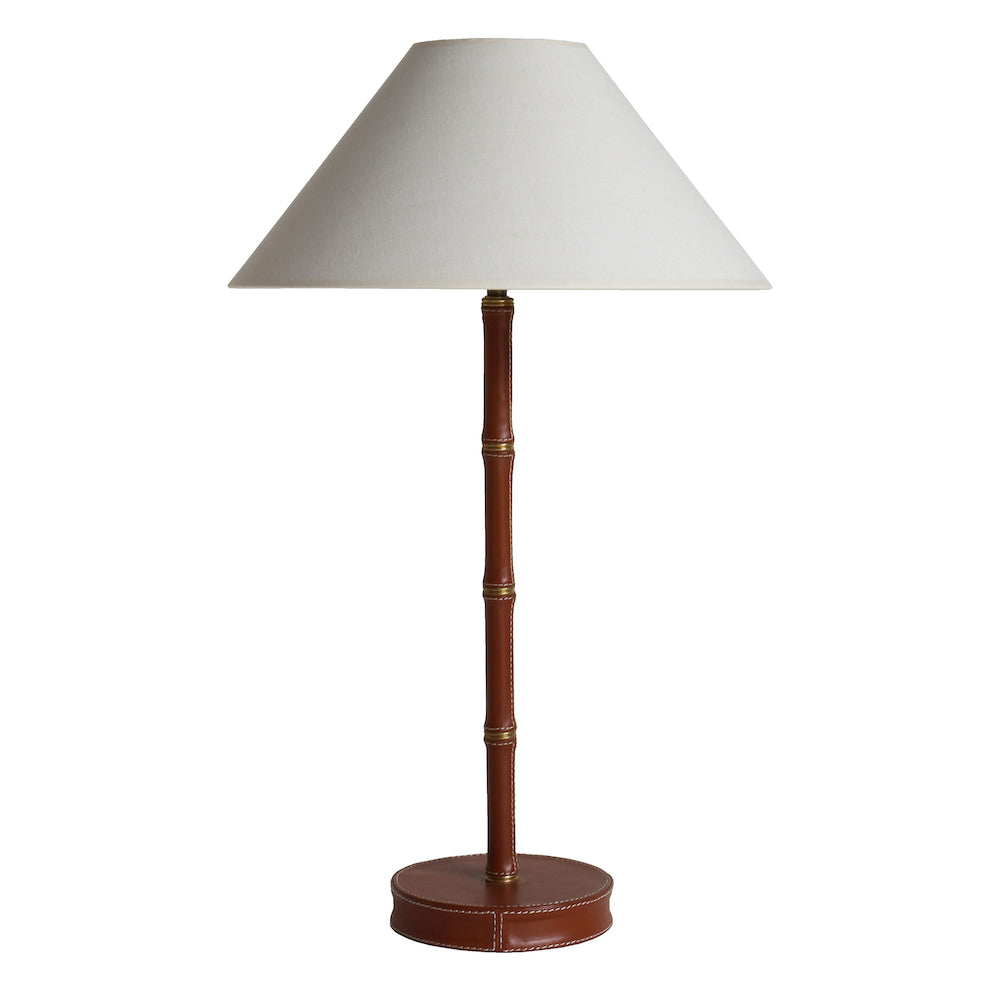 Table lamp inspired by the work of Jacques Adnet. Lamp features a brass bamboo-style stem, with base and stem covered in tan stitched leather.