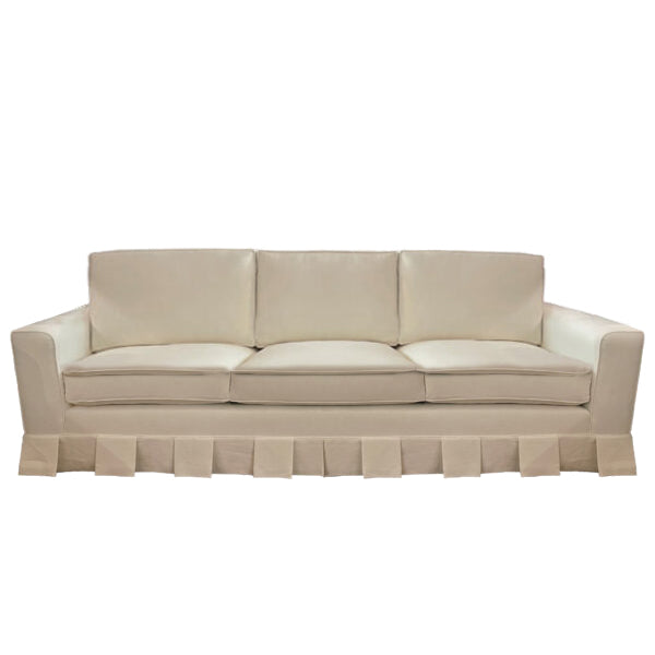 Upholstered sofa with back cushions and pleated skirts. Shown in our Brussel Oyster.